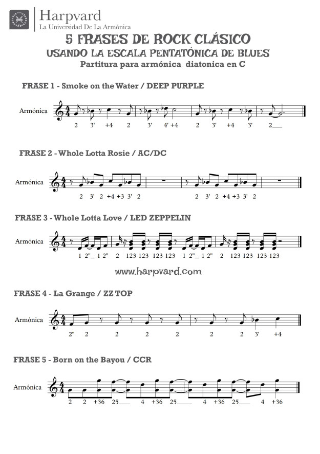 En este vídeo te enseñamos 5 frases famosas de rock clásico compuestas usando la escala pentaónica de blues que tan bien suena en la armónica diatónica.Empezamos por Smoke on the Water (Deep Purple) que es la frase más didáctica del rock para entender la escala pentatónica de blues.La segunda frase es Whole Lotta Rosie (AC/DC) en la que además de usar las notas de la escala introducimos el concepto de nota fantasma (gost note).En la tercera frase, Whole Lotta Love (Led Zeppelin) te enseñamos a encontrar notas graves de la escala que posiblemente no tendrías en cuenta hasta ahora.La cuarta frase es uno de los grandes clichés del rock, La Grange (ZZ Top) en la que te enseñamos a respirar y a ganar velocidad.Por último te enseñamos un arreglo para tocar Born on The Bayou y practicar las notas octavadas (Tongue Blocking).Esperamos que sea para ti una clase práctica, didáctica y divertida.Aquí tienes la partitura:
