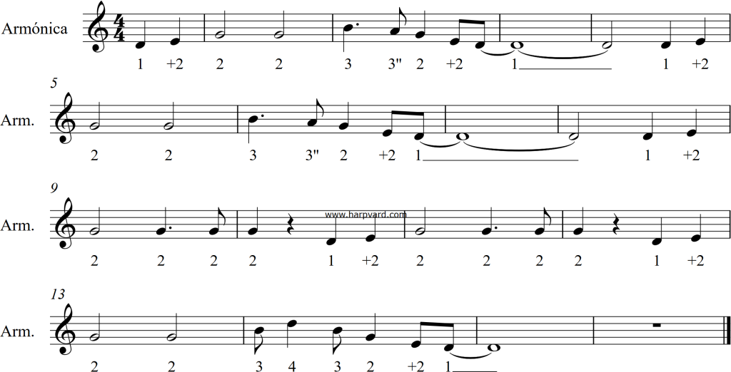 Vamos un paso más, ¿por qué no asocias cada número a una nota musical? No hace falta que uses un pentagrama, solo escribe sobre el número la nota que suena. Es muy importante que asocies los números de la tablatura a la nota musical que suena pues no tocamos números sino notas. De hecho el proceso debería ser el inverso: tocamos notas de las cuales conocemos el nombre y las codificamos con números que nos ayudan a saber dónde están en la armónica. Empieza a pensar en notas, al menos en las melodías sencillas, te va ayudar a entender muchas cuestiones musicales.